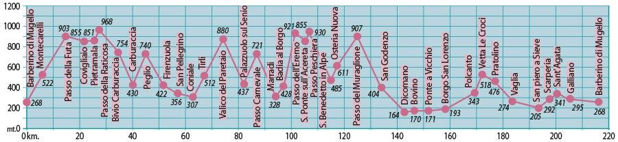 | Note sul percorso | Il fondo stradale è totalmente asfaltato, a tratti sconnesso. Richiede notevole preparazione. Ottimo per preparare super-randonnées. |