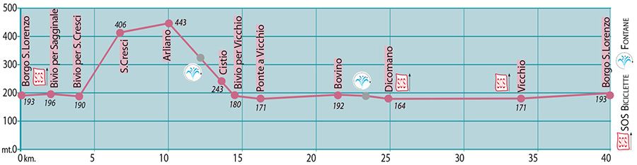 | Note sul percorso | La prima parte è in paesaggio "antico". Il fondo stradale è da appena accettabile a buono. Attenzione al traffico tra Dicomano e Borgo San Lorenzo |